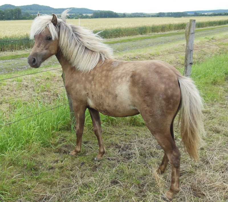 Eine umgängliche und bewegungsstarke Jungstute, Dunkelfuchs mit weissem Behang.